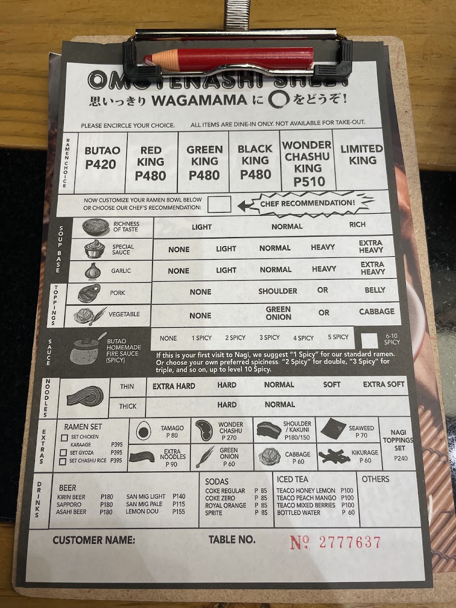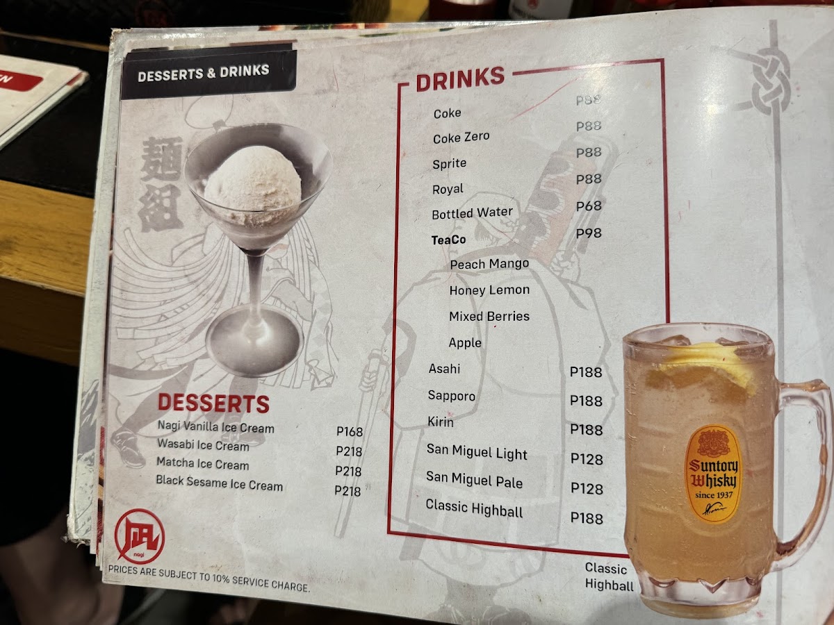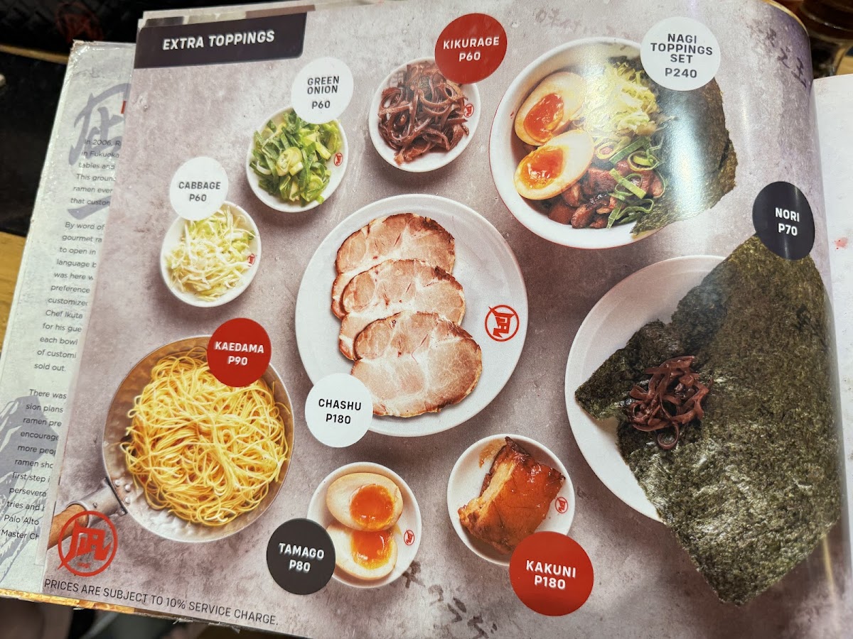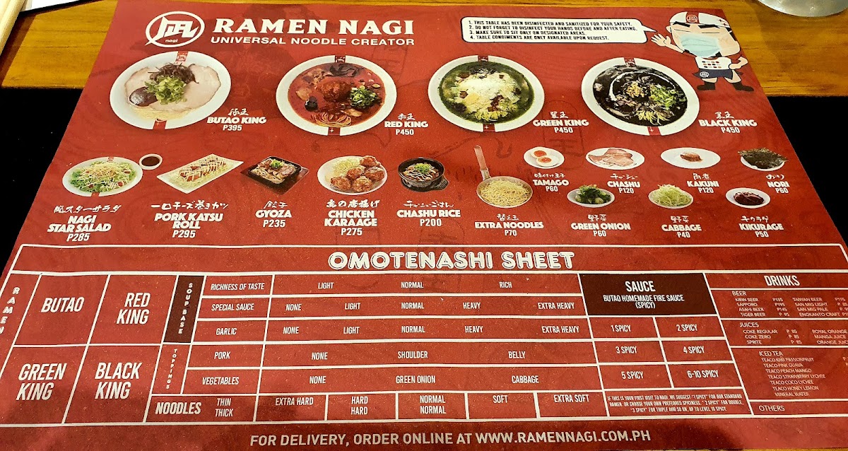 At Ramen Nagi - Robinsons Galleria, the menu presents a well-rounded snapshot of the brand’s signature ramen philosophy while remaining convenient and customizable for diners on the go. The Hot Nagi To-Go selection anchors the experience with crowd favorites like Green King, Black King, Red King, Butao King, and the indulgent Wonder Kakuni KingButao King, each reflecting Ramen Nagi’s mastery of bold broths and carefully balanced flavors. To complement the ramen, the beverage list keeps things simple and refreshing with Coke Zero, Sprite, Bottled WaterRoyal, while those seeking a relaxed pairing can choose from Sapporo Beer, San Miguel Light, Asahi Super DryKirin Ichiban Beer under the alcoholic beverages. Customization is another strong point, thanks to the Hot Nagi To-Go Extras such as Extra Noodles (Thick), Extra Noodles (Thin ), Extra Nori, Extra Tamago, and Nagi Toppings (All Toppings)Extra Noodles (Thin ), allowing diners to fine-tune each bowl to personal preference. Finally, the sides-including Chasu Rice, 3 Pcs, Curry Spring Roll3pcs, and Nagi Star Salad-add variety and balance, making the menu feel complete. Overall, the menu successfully summarizes what Ramen Nagi does best: distinctive ramen, flexible add-ons, and approachable accompaniments that come together as a satisfying conclusion to the dining experience.